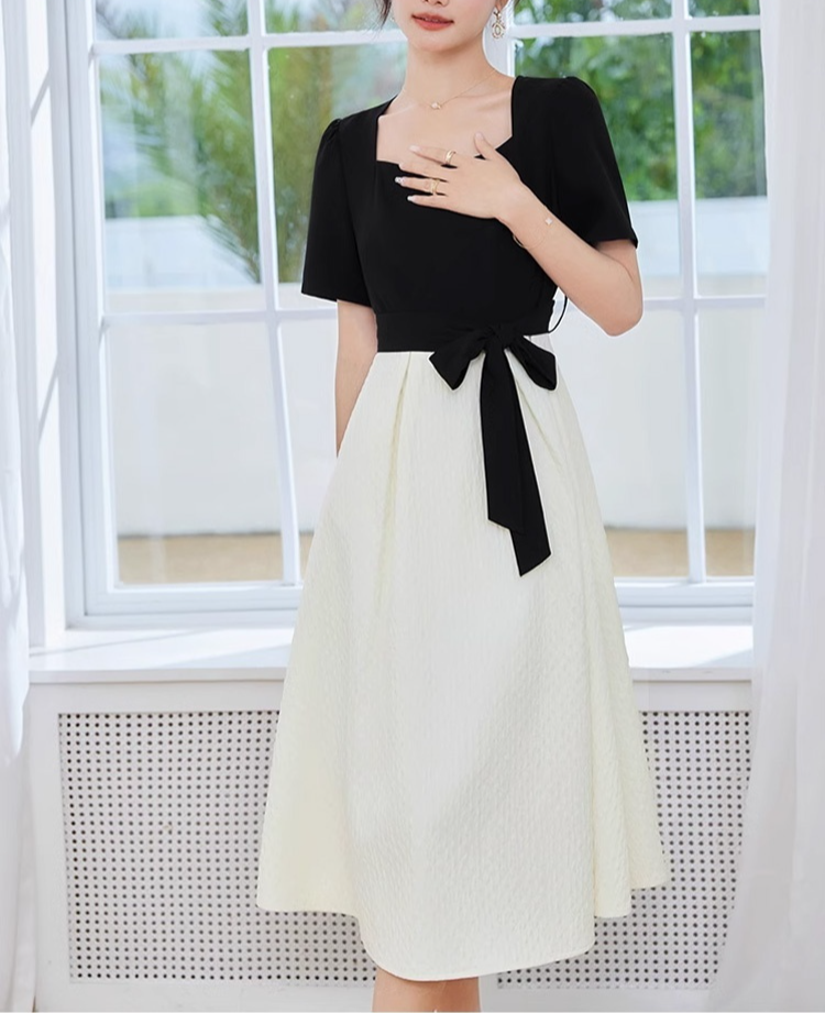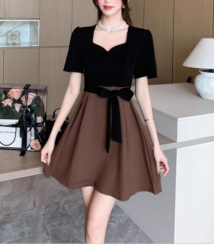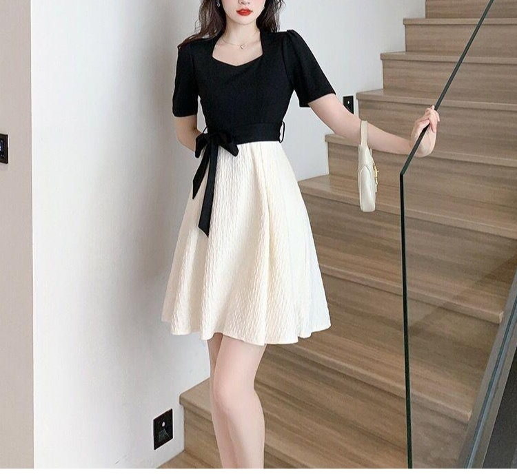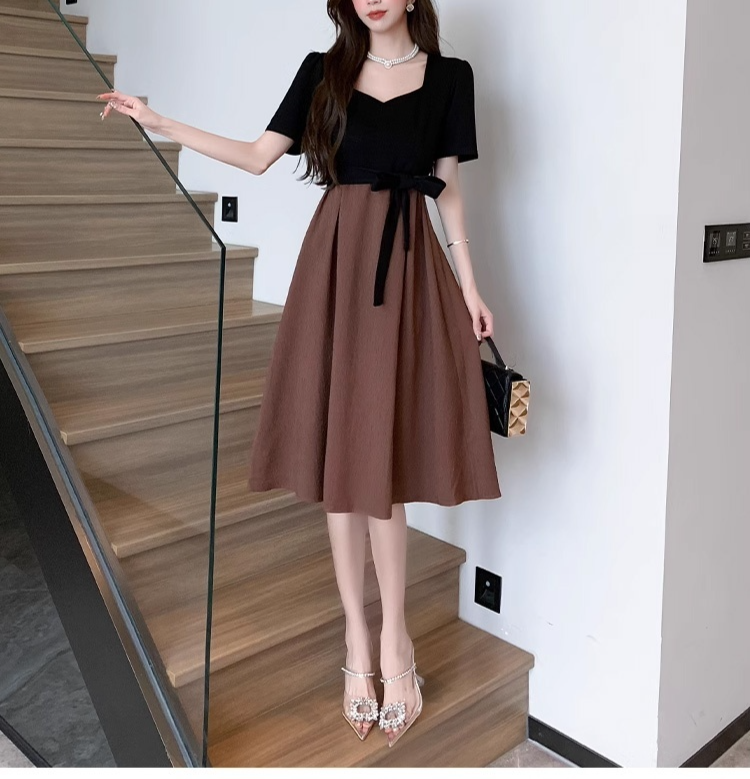 小柄女性向け夏用ヘップバーンスリムワンピース・ロングスカート風フェイクツーピース